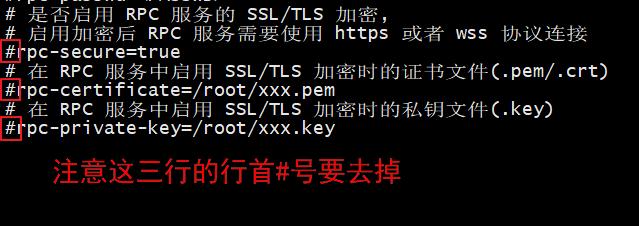 # 启用加密后 RPC 服务需要使用 https 或者 wss 协议连接ps: 一般来说如果是用一键脚本搭的Aria2,这三个选项默认是屏蔽的,注意去掉前面的#