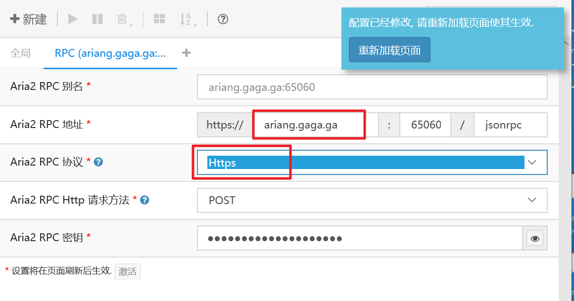注意:不能填IP地址了,要填证书对应的域名。ariang.gaga.ga