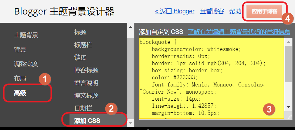 在“主题背景设计器”里,依次选择“高级”、“添加CSS”,在右侧的文本框中对blockquote进行自定义CSS样式。最后“应用于博客”。
