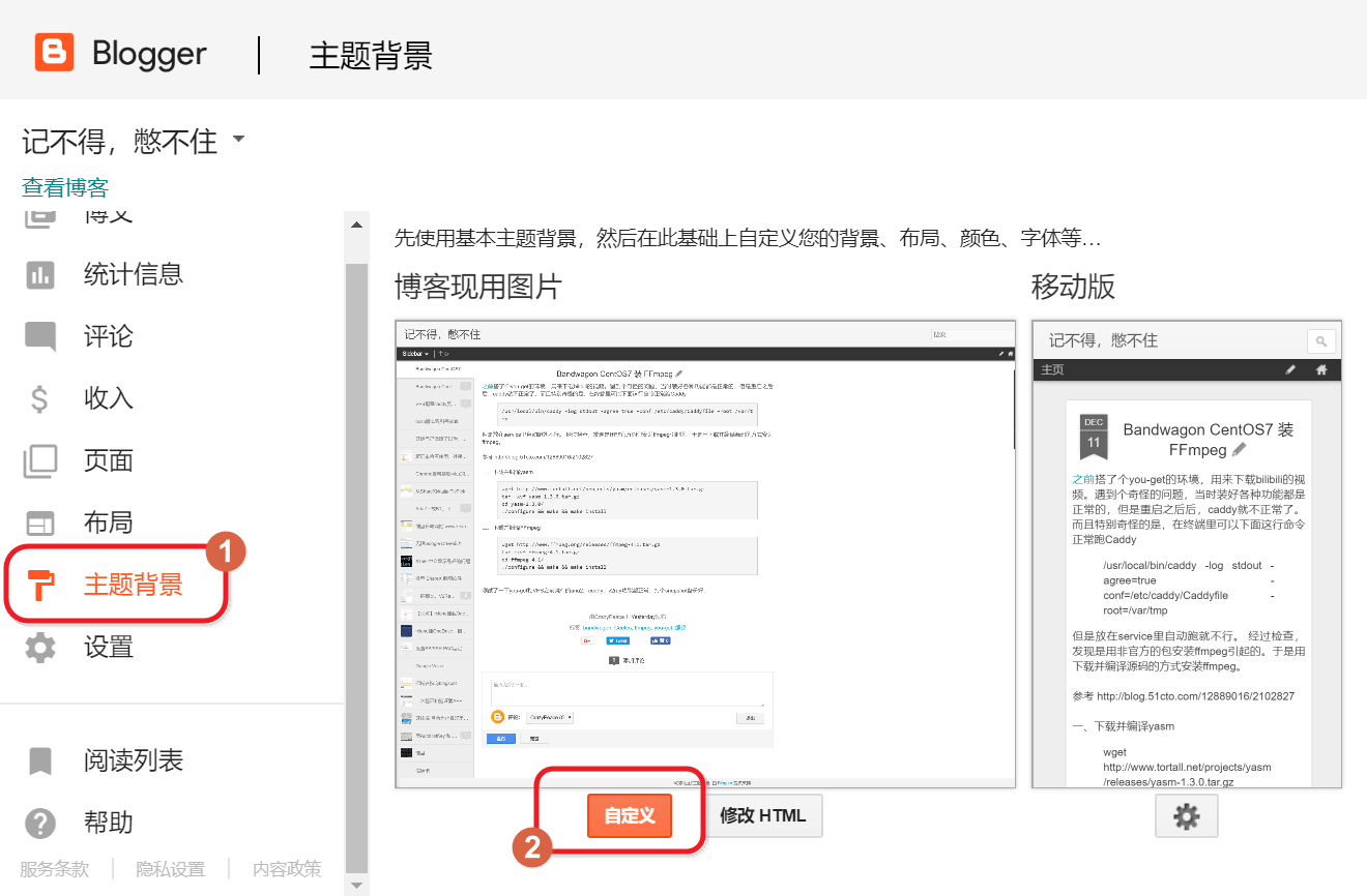 进入Blogger的后台,左侧选择“主题背景”,右侧再选择“自定义”。
