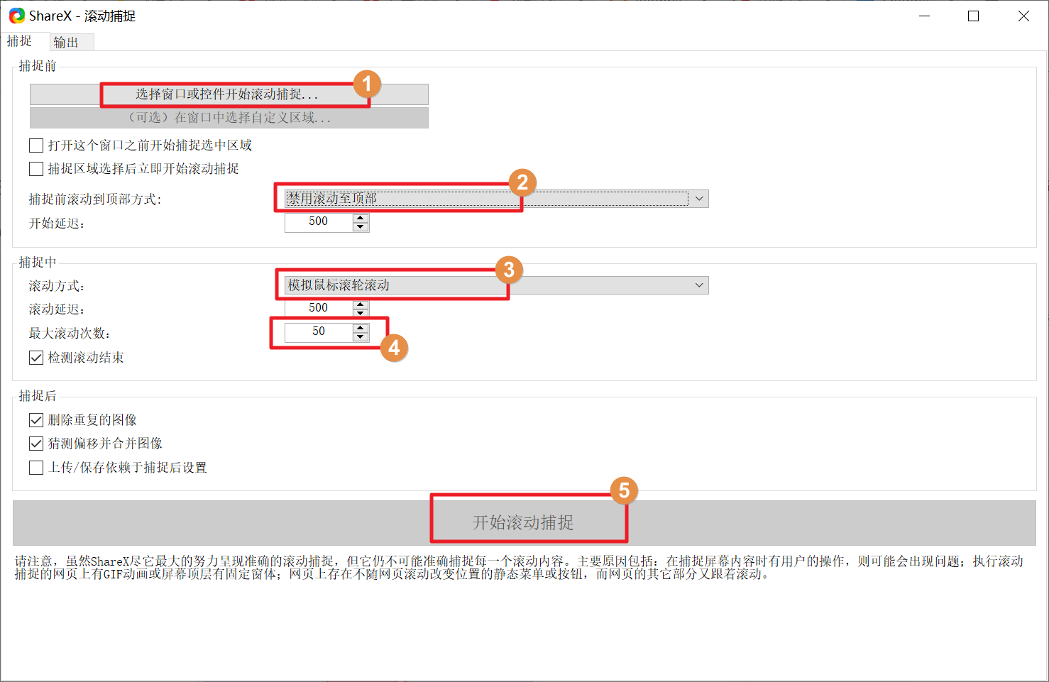 第3步的滚动方式需要根据实际情况选择。在Xshell终端窗口的场景下,如果使用默认选项——“自动尝试所有方法”,每次滚动幅度比较大,最终合成出来的图片会漏掉一些部分。我使用的是“模拟鼠标滚轮滚动”。