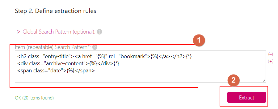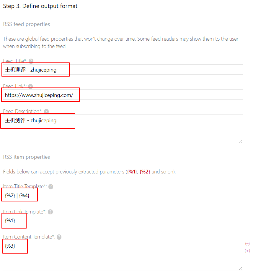 得到这段代码的过程如下,同样的颜色表示在Feed43的系统中有对应关系。可以用正则表达式的思路去理解。{%}指代在后续的步骤中会被引用的字段。