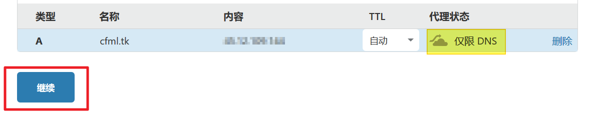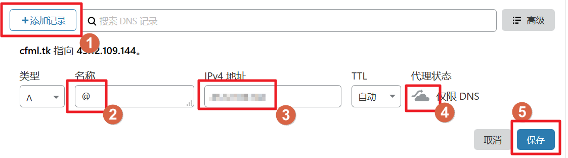 点击“添加记录”,“名称”中输入@,IPv4地址输入VPS的公网IP(还记得VPS发来的邮件吗?)代理状态那里要点一下图标,从橙色的云朵“已代理”变成灰色的云朵“仅限DNS”,点击“保存”。
