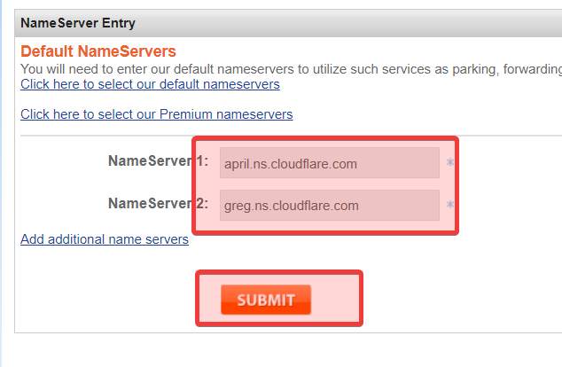 将原有的NameSever全部删掉,填写Cloudflare指定的2个名称服务器. (还记得前面Cloudflare操作的最后一步吗?)