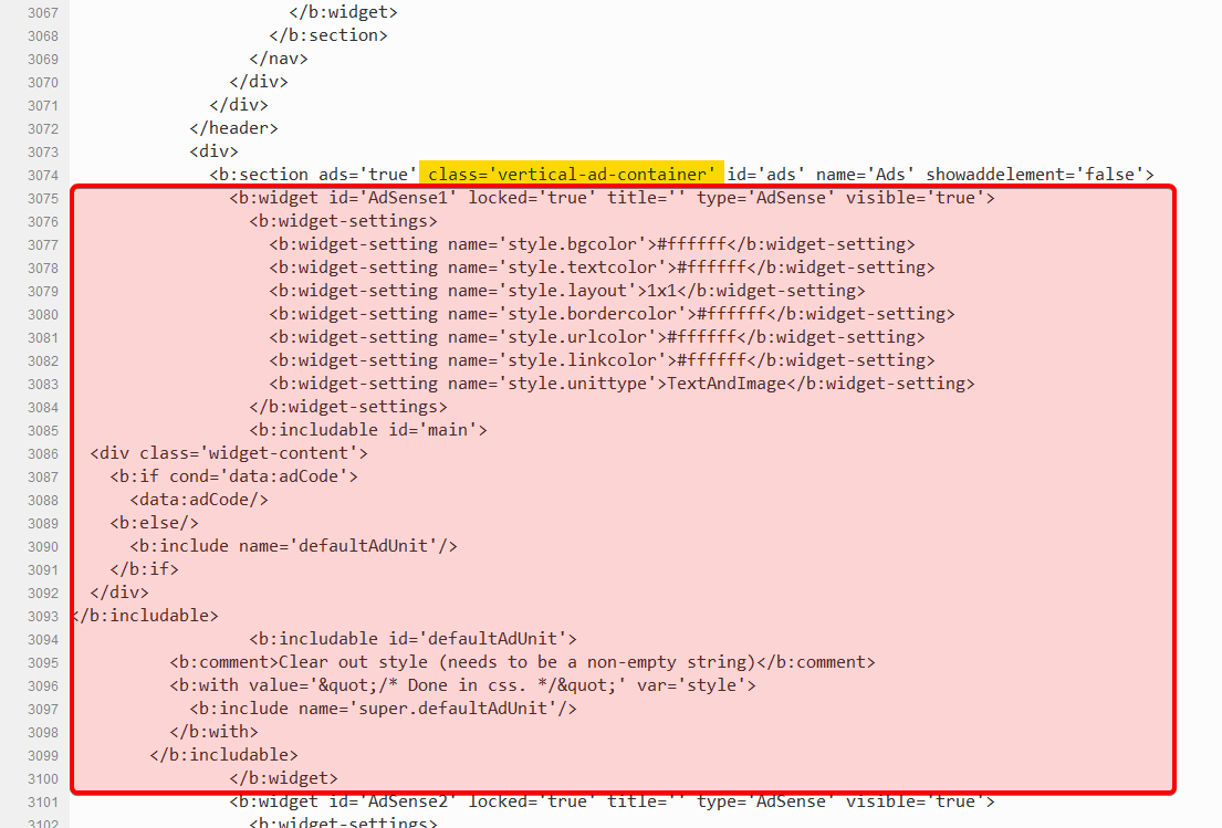下面的<b:widget > ... </b:widget> 就是Adsense区域了
