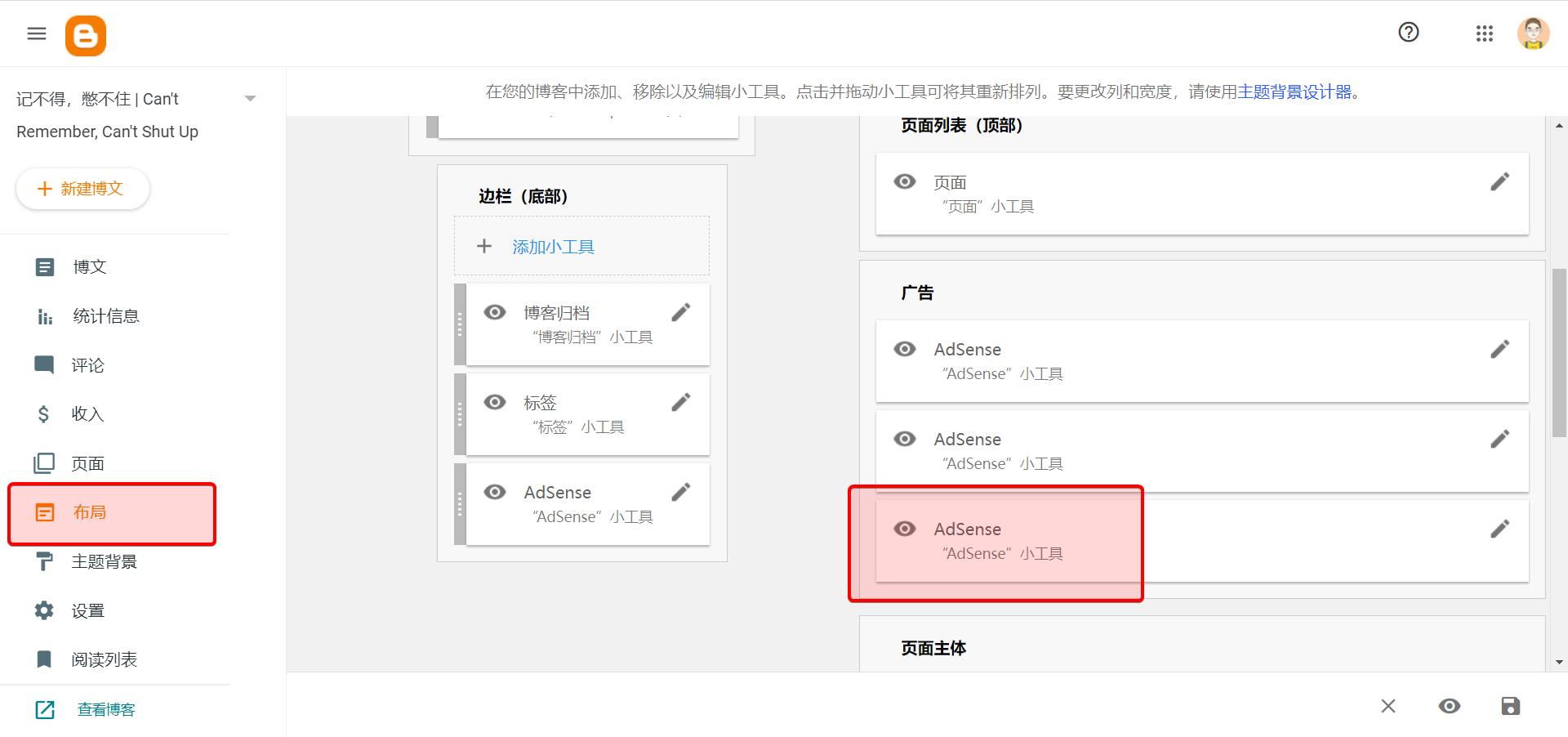 可以看到这里有AdSense1和AdSense2. 在整个模板文件里还有一个AdSense3, 是位于侧边栏. 所以我们在AdSense2的下方添加一个AdSense4.