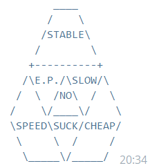 +---------+/ \/ \/ STABLE \/ \+---------+---------+/ \ / \ / \/ \ E.P./ \ SLOW/ \/ \ / NO \ / \/ \ / \ / \+ SPEED +---------+ CHEAP +\ \ / /\ \ BAD / /\ \ / /\ \ / /+---------+---------+
