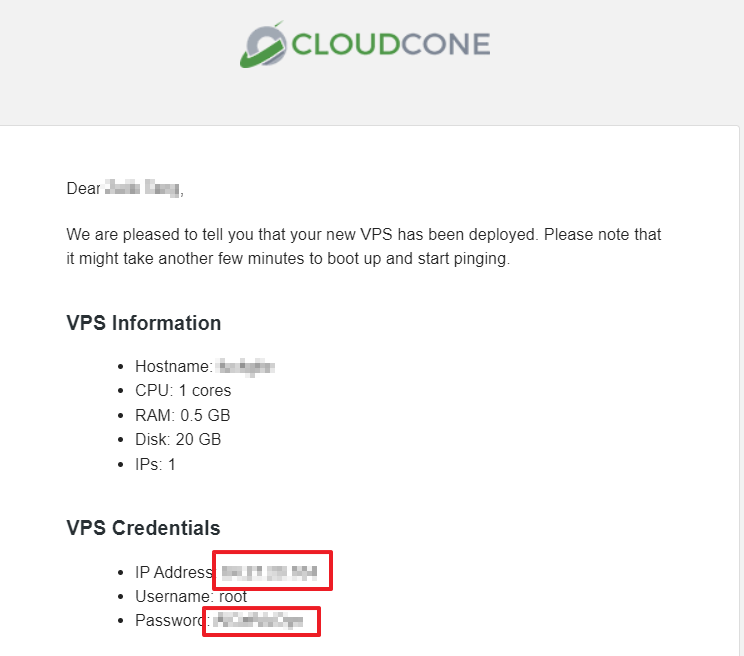注意你的邮箱,会收到一封来自CloudCone, LLC的,标题为“Your VPS is Provisioning”的邮件。