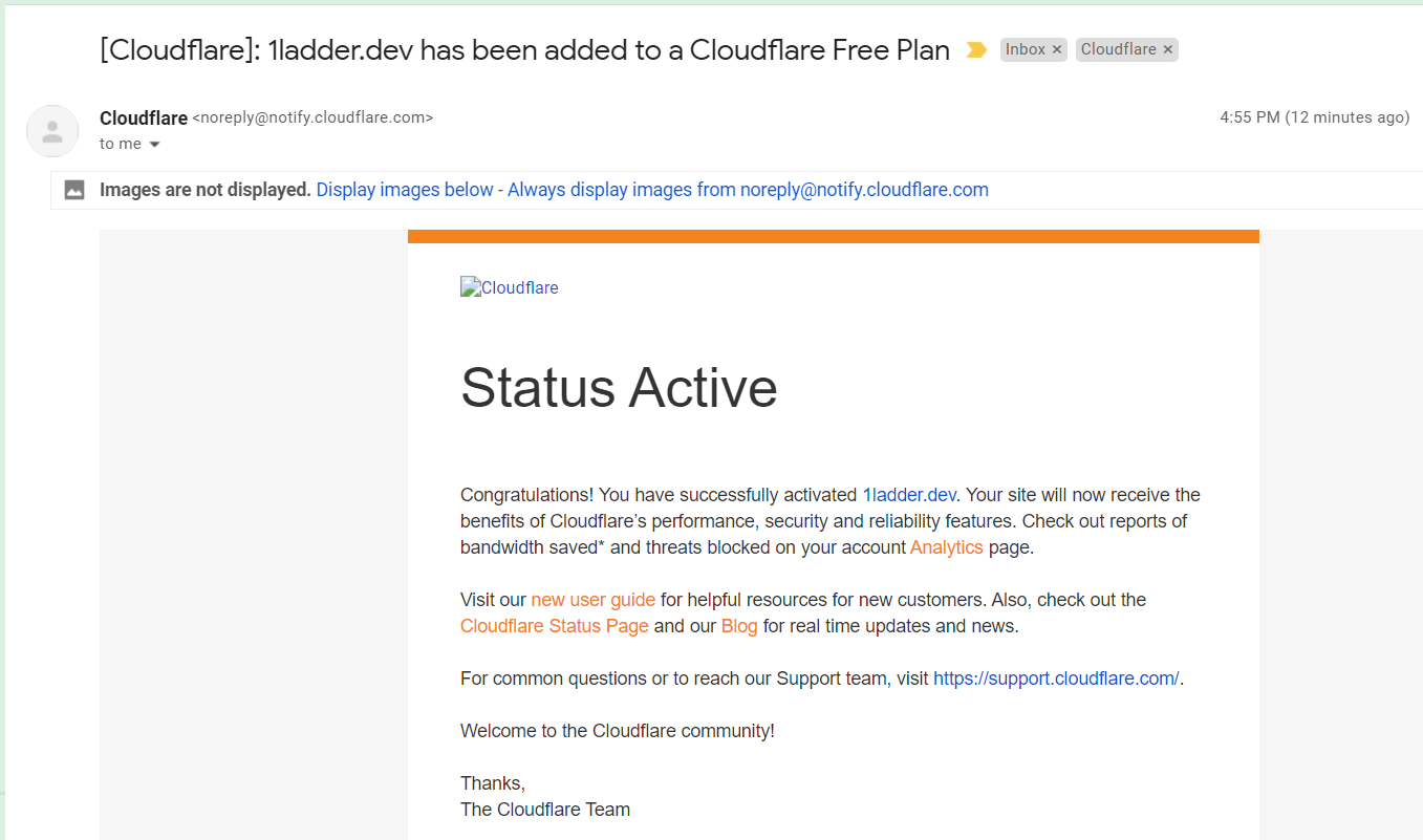 当Cloudflare检测到你设置好了以后,你会收到一封邮件,如下: