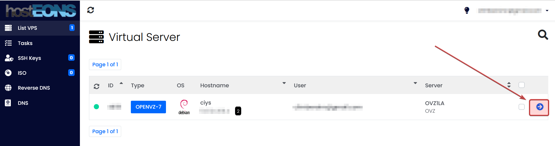 点击你的VPS那一行最右侧的箭头进入你的VPS