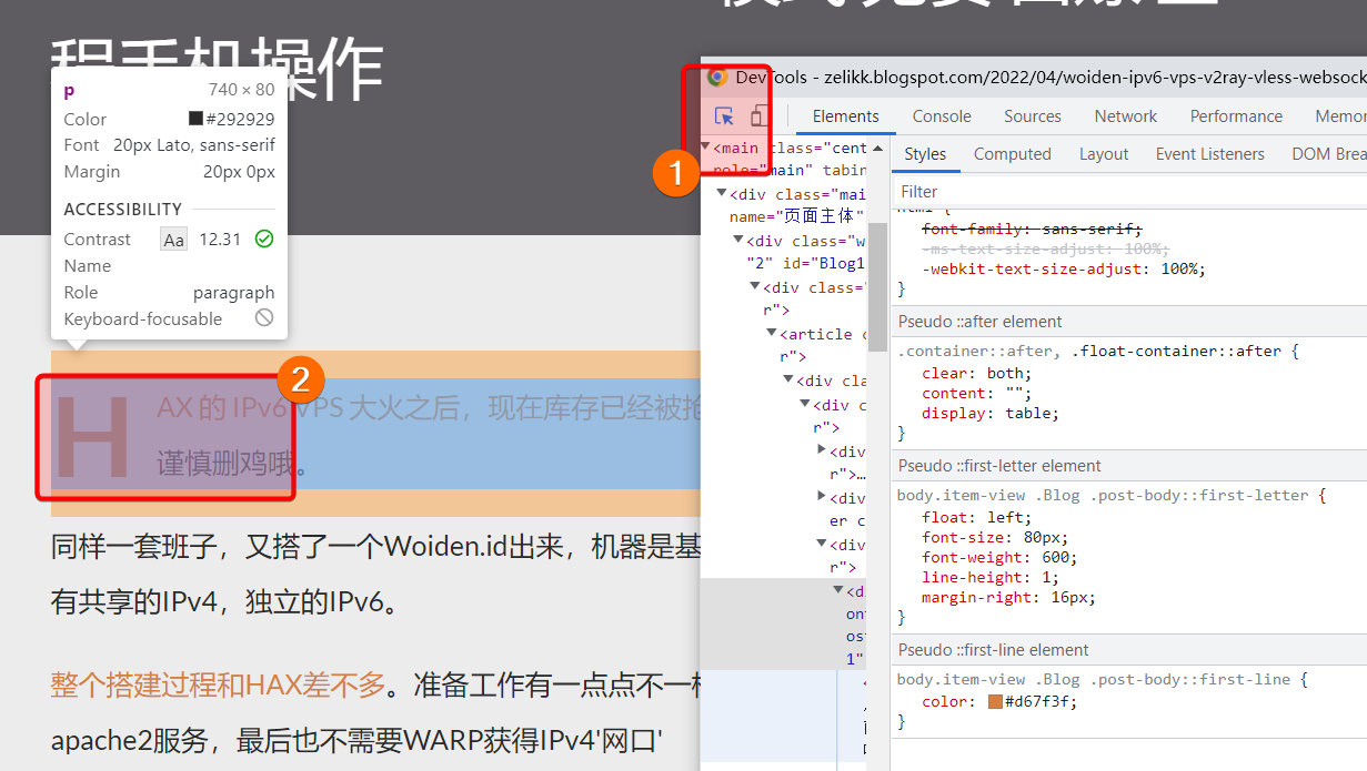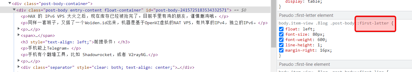 Blogger模板Notable系列去掉首字母变大占两行的CSS样式 查看相关主题: blogger 当在Blogger中使用Notable系列模板时,每篇文章的首字母会变大,占两行。如下:在一些以文字为主的博客站也许很合适,但是放在技术类的站我个人觉得就不太适合了。Notable系列模板包括:先通过F12模式查看首行的CSS然后看到到这个 first-letter进到模板编辑,查找 first-letter并全部删掉保存之后,就完成了。效果如下: 评论