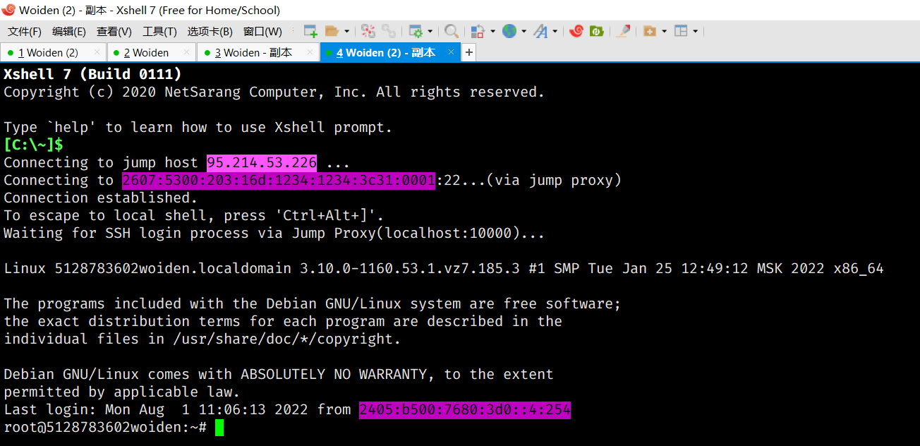 所以需要2个Woiden VPS,其中一个Woiden VPS-A作为SSH通道IPv4-IPv6的跳板. 登录成功VPS-A的共享IPv4的SSH端口后,ssh命令登录另一个Woiden VPS-B的IPv6IP的SSH端口(22)