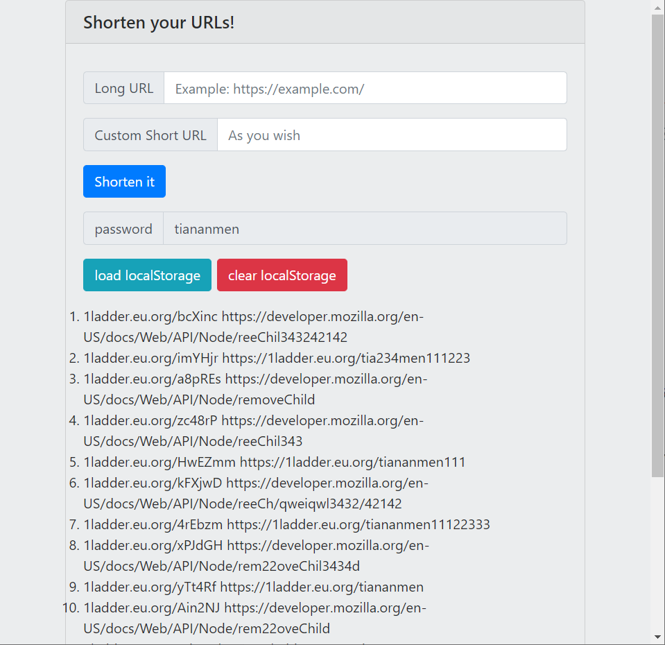 // 成功生成短链if (res.status == "200") {let keyShortURL = window.location.host + res.key;let valueLongURL = document.querySelector("#longURL").value;// save to localStoragelocalStorage.setItem(keyShortURL, valueLongURL);// add to urlList on the pagelet urlList = document.querySelector("#urlList")let child = document.createElement('li')let text = document.createTextNode(keyShortURL + " " + valueLongURL)child.appendChild(text)urlList.append(child)}