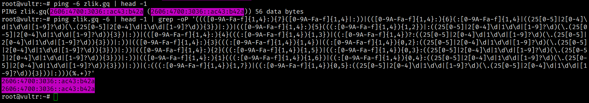 ping 域名 -6 -c 1 -W 2 | head -1 | grep -oP '((([0-9A-Fa-f]{1,4}:){7}([0-9A-Fa-f]{1,4}|:))|(([0-9A-Fa-f]{1,4}:){6}(:[0-9A-Fa-f]{1,4}|((25[0-5]|2[0-4]\d|1\d\d|[1-9]?\d)(\.(25[0-5]|2[0-4]\d|1\d\d|[1-9]?\d)){3})|:))|(([0-9A-Fa-f]{1,4}:){5}(((:[0-9A-Fa-f]{1,4}){1,2})|:((25[0-5]|2[0-4]\d|1\d\d|[1-9]?\d)(\.(25[0-5]|2[0-4]\d|1\d\d|[1-9]?\d)){3})|:))|(([0-9A-Fa-f]{1,4}:){4}(((:[0-9A-Fa-f]{1,4}){1,3})|((:[0-9A-Fa-f]{1,4})?:((25[0-5]|2[0-4]\d|1\d\d|[1-9]?\d)(\.(25[0-5]|2[0-4]\d|1\d\d|[1-9]?\d)){3}))|:))|(([0-9A-Fa-f]{1,4}:){3}(((:[0-9A-Fa-f]{1,4}){1,4})|((:[0-9A-Fa-f]{1,4}){0,2}:((25[0-5]|2[0-4]\d|1\d\d|[1-9]?\d)(\.(25[0-5]|2[0-4]\d|1\d\d|[1-9]?\d)){3}))|:))|(([0-9A-Fa-f]{1,4}:){2}(((:[0-9A-Fa-f]{1,4}){1,5})|((:[0-9A-Fa-f]{1,4}){0,3}:((25[0-5]|2[0-4]\d|1\d\d|[1-9]?\d)(\.(25[0-5]|2[0-4]\d|1\d\d|[1-9]?\d)){3}))|:))|(([0-9A-Fa-f]{1,4}:){1}(((:[0-9A-Fa-f]{1,4}){1,6})|((:[0-9A-Fa-f]{1,4}){0,4}:((25[0-5]|2[0-4]\d|1\d\d|[1-9]?\d)(\.(25[0-5]|2[0-4]\d|1\d\d|[1-9]?\d)){3}))|:))|(:(((:[0-9A-Fa-f]{1,4}){1,7})|((:[0-9A-Fa-f]{1,4}){0,5}:((25[0-5]|2[0-4]\d|1\d\d|[1-9]?\d)(\.(25[0-5]|2[0-4]\d|1\d\d|[1-9]?\d)){3}))|:)))(%.+)?' | head -1