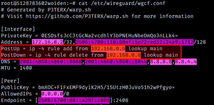 然后再参考上面的PostUp PostDown去写到wgcf.conf里面