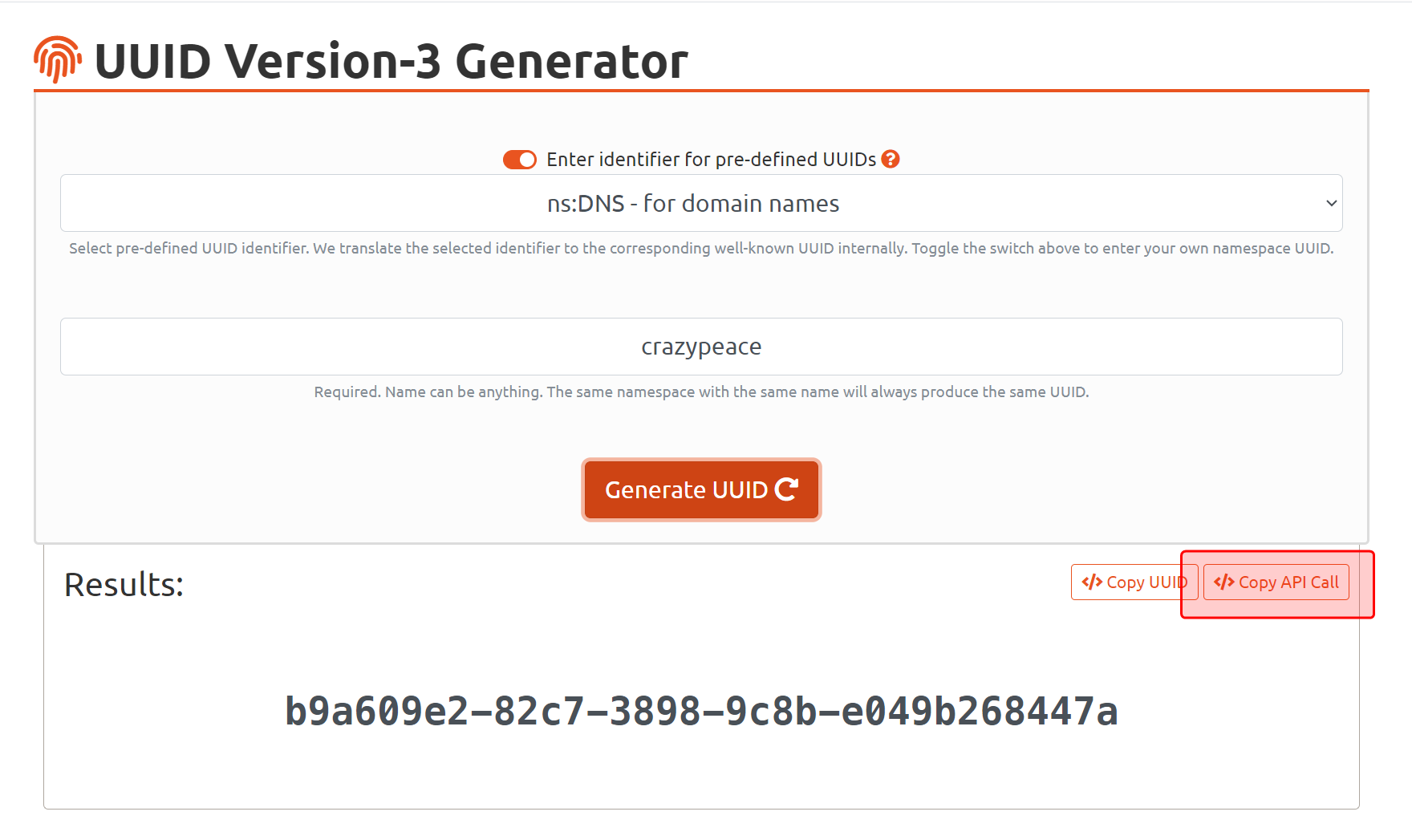 https://www.uuidtools.com/api/generate/v3/namespace/ns:dns/name/crazypeace
