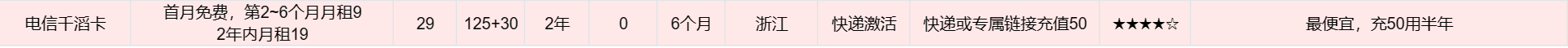 2年内月租19 29 125+30 2年 0 6个月 浙江 快递激活 快递或专属链接充值50 ★★★★☆ 最便宜,充50用半年