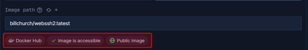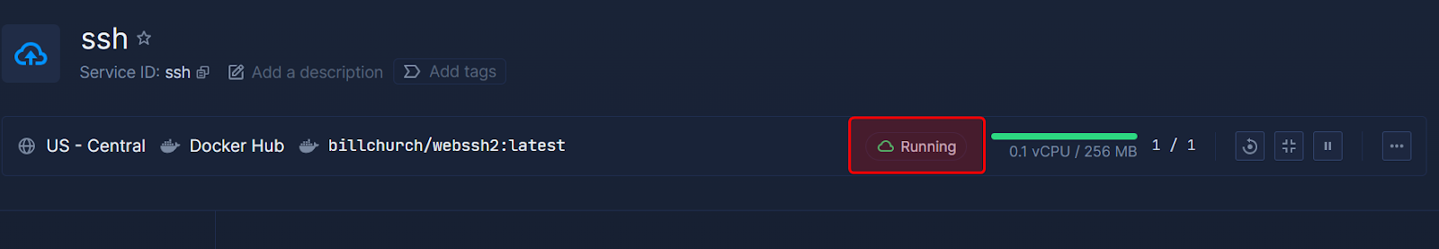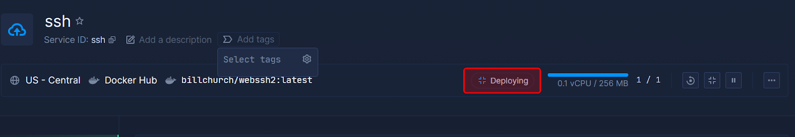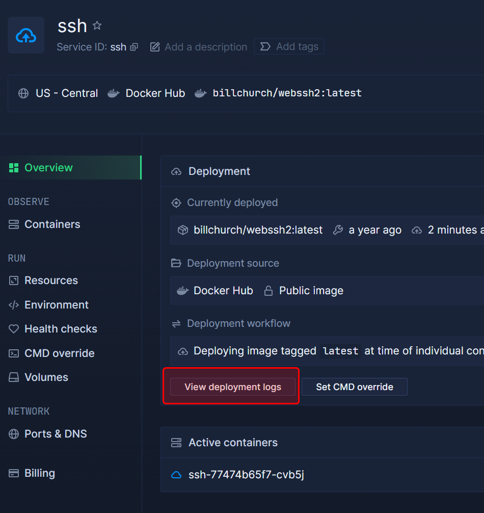 部署成功以后, 关注 Port 这里, 因为你设置了对外暴露HTTP端口, 这里会有一个域名链接.billchurch/webssh2 的使用方法比较特别.
