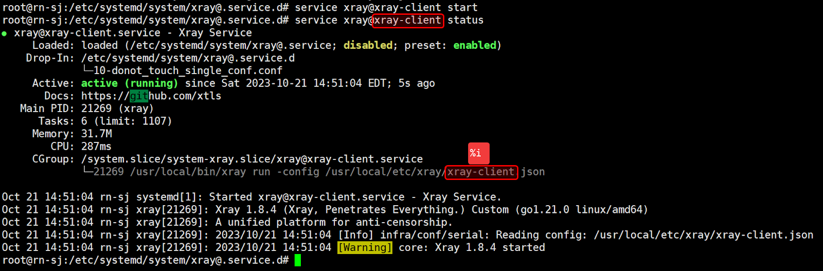 所以整个逻辑是这样的, 我们执行 service xray@xray-client start 的时候, 应用的是 [email protected] 这个模板(template). 然后 xray-client 被认为是 实例(instance).
