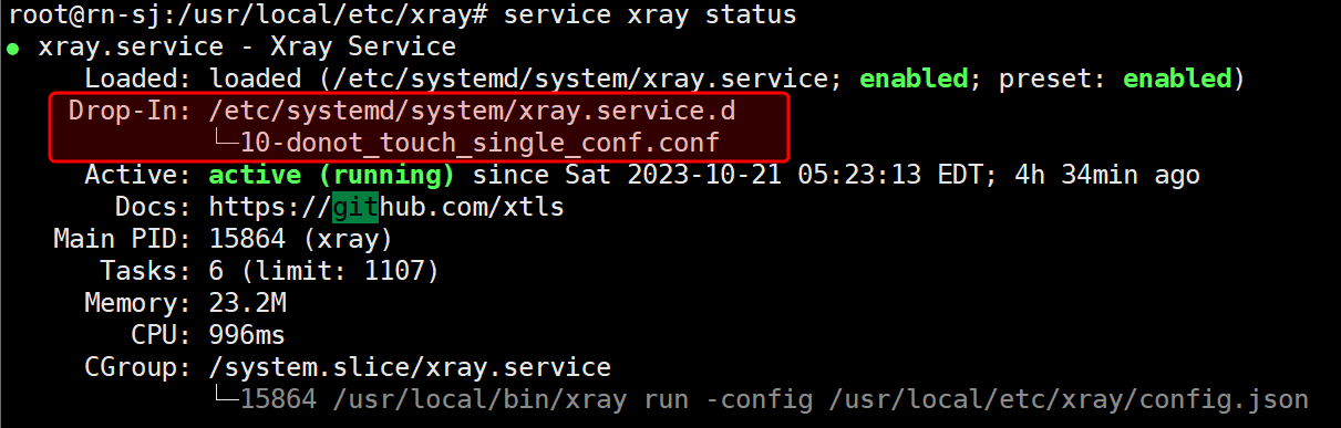 然后再查看服务状态, 发现启动命令使用的是我们期望的 xray.json , 也看到了 Drop-In 了我们新增的 customized.conf 文件.