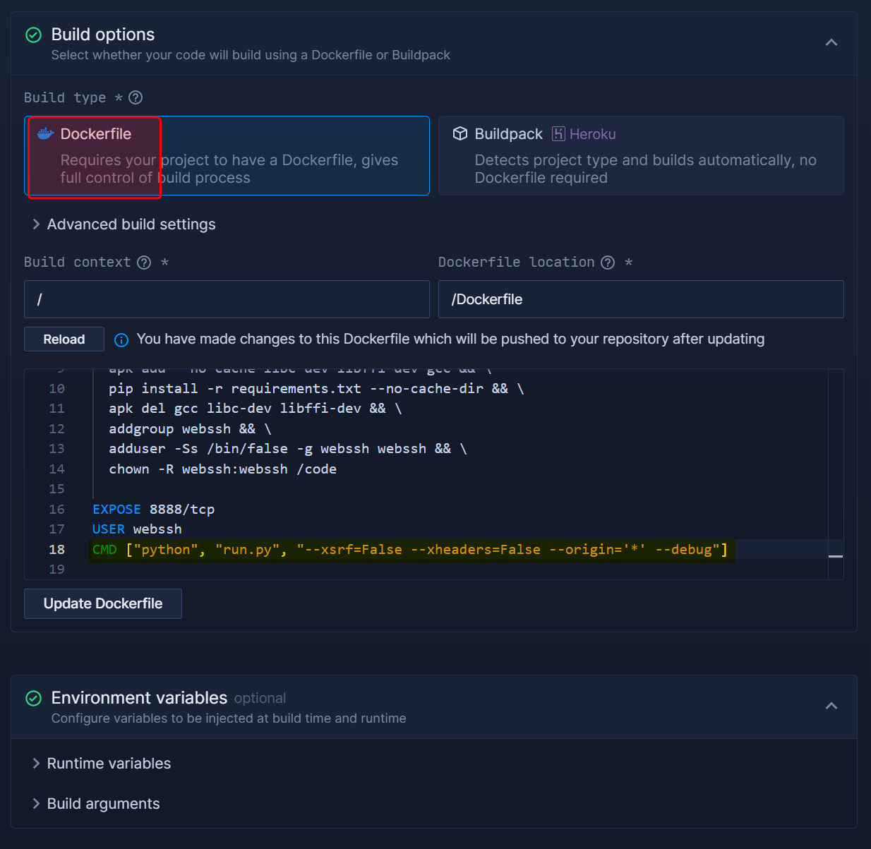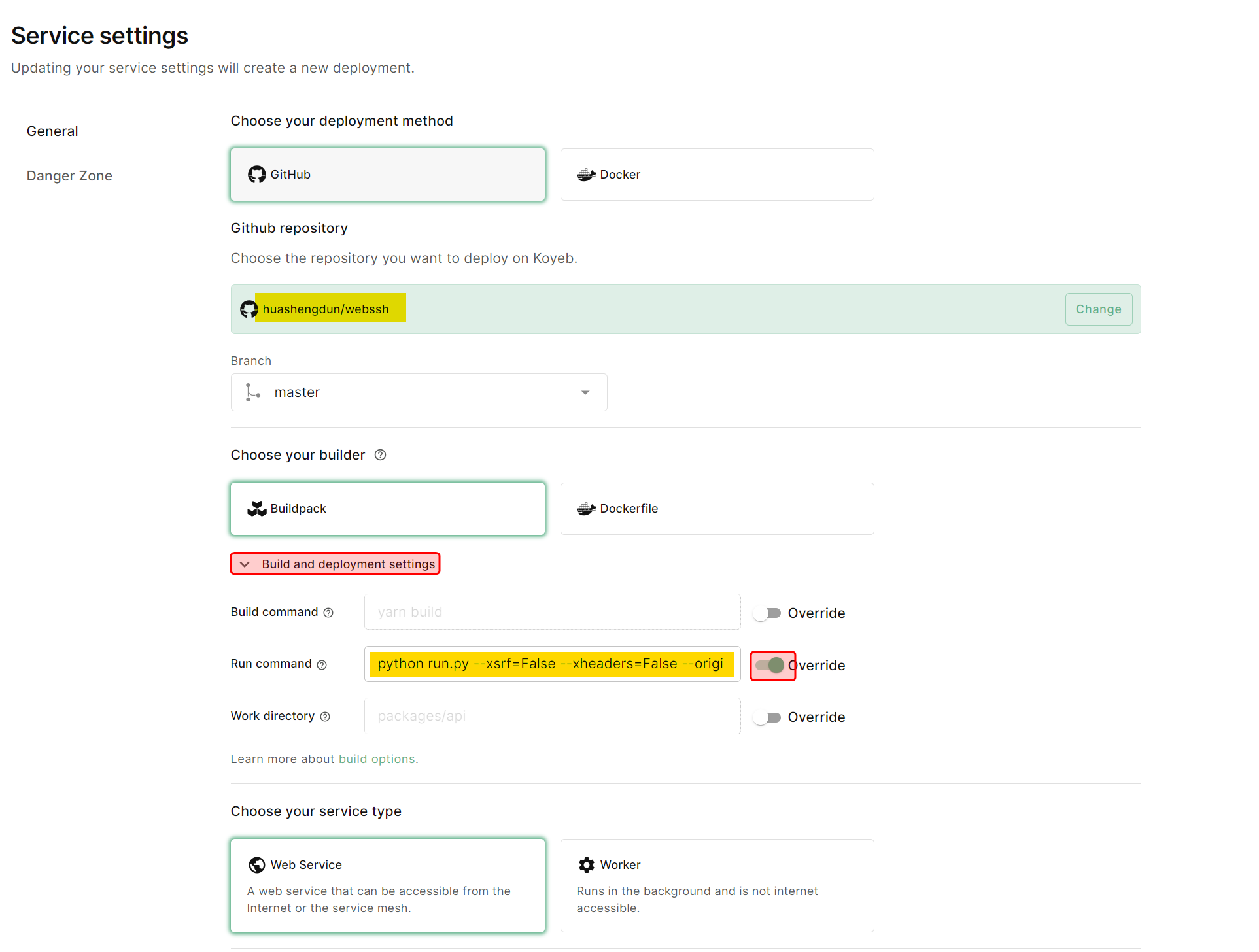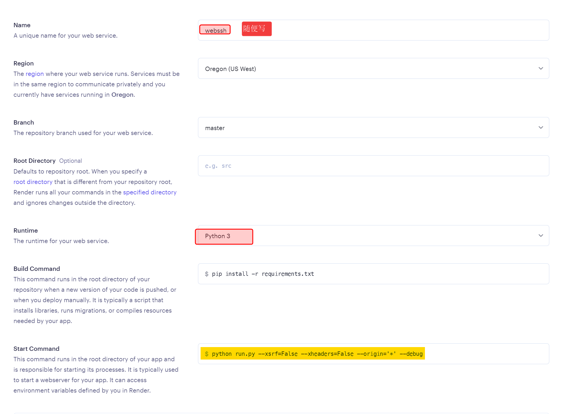这个webssh项目和前面几个webssh都不一样. 不是加载Docker镜像, 而是加载 Github Repo, 或者创建 Python 环境; 然后设置启动命令.