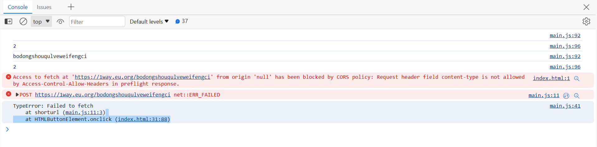 想调试 Url-Shorten-Worker, 把 index.html 保存在本地电脑上, 调用服务器https://1way.eu.org/的API, 报错