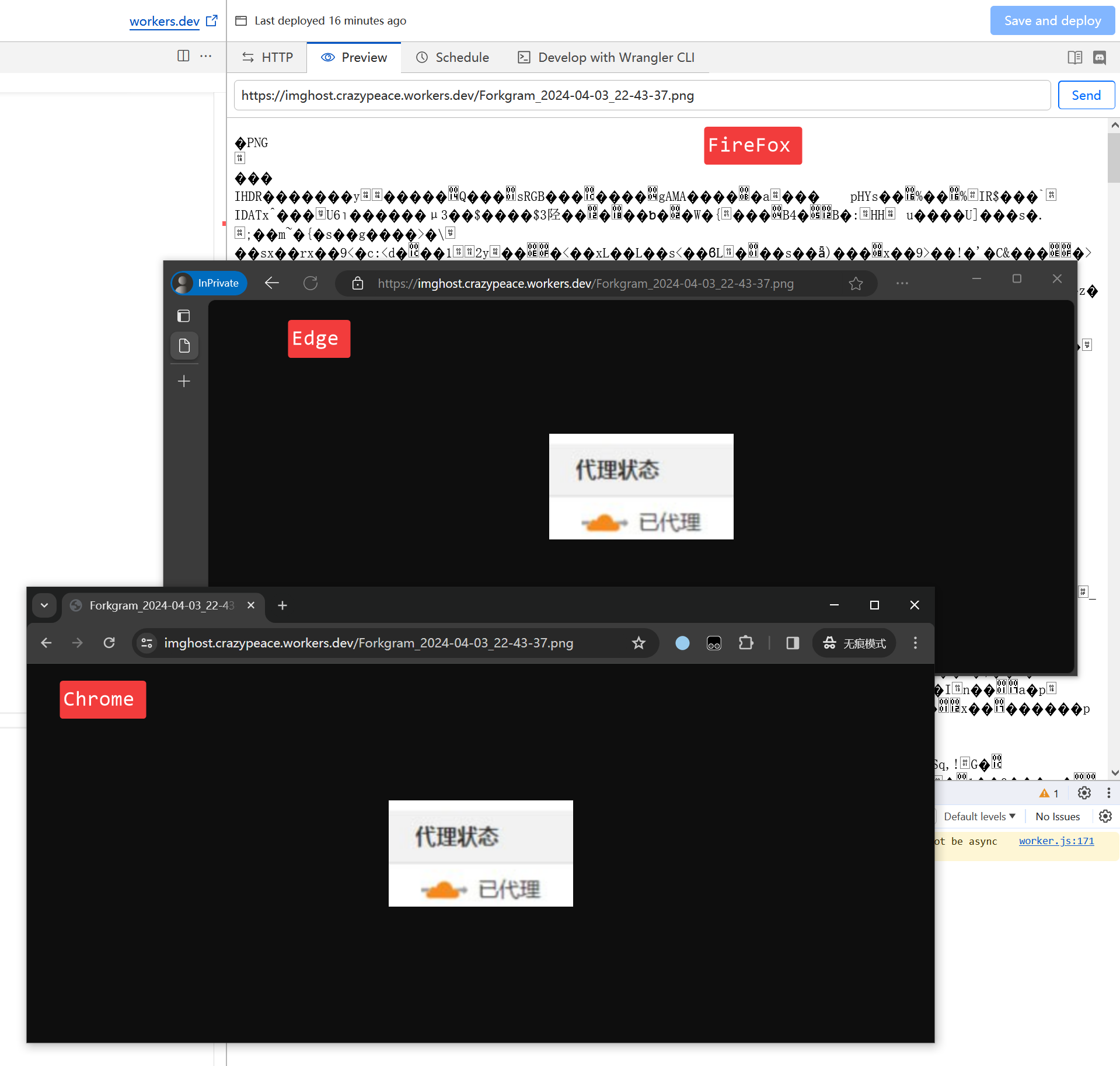 将图片以Blob的形式返回给浏览器 FireFox 乱码 其它浏览器正常 点击标签看相关主题: 开发 Url-Shorten-Worker 还是之前的短链项目.今天拿 FireFox 来调试, 发现图床的显示效果有问题. Edge 和 Chrome 显示正常.找了一圈原因, 发现是返回的时候, 指定了 {'Content-Type': 'text/plain;charset=UTF-8'},所以浏览器当文本处理了.注释掉就正常了.如果是以前用过我的代码的朋友, 同步 worker.js 的内容就行了.========Githubhttps://github.com/crazypeace/url-Shorten-Worker/演示站https://imghost.crazypeace.workers.dev/imghostimghost 评论