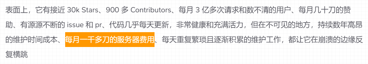 有一个叫RSSHub的项目, 每个月服务器需要一千多刀的费用. 这种越是不占用你的视线和注意力的服务, 越是找不到商业化的方法cover服务器的费用.