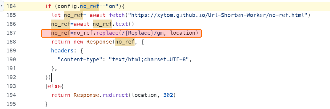 在 worker.js 里面, 加载了这个 no_ref.html 之后, 对奇异字符串 {Replace} 进行替换为目标长链接. 你可以理解为这个html文件被修改了. 然后再返回给浏览器显示(执行).
