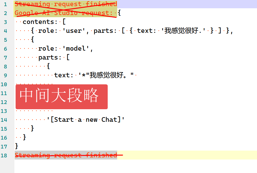 * 注意, 要把下图中所示的 "Streaming request finished" 删除, 再把 "Google AI Studio request:" 删除. 这样才是合格的JSON格式