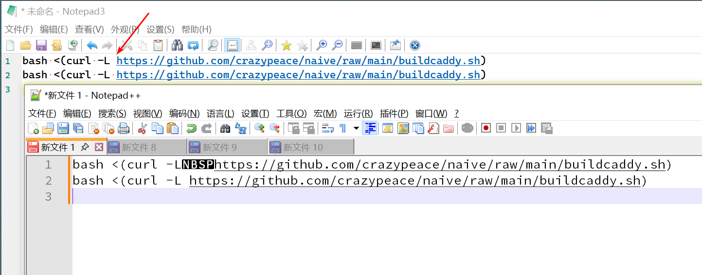 首先是放在我常用的 notepad3 里面对比, 发现有个"空格"似乎有点不"正常".