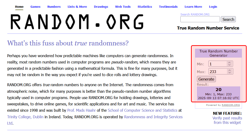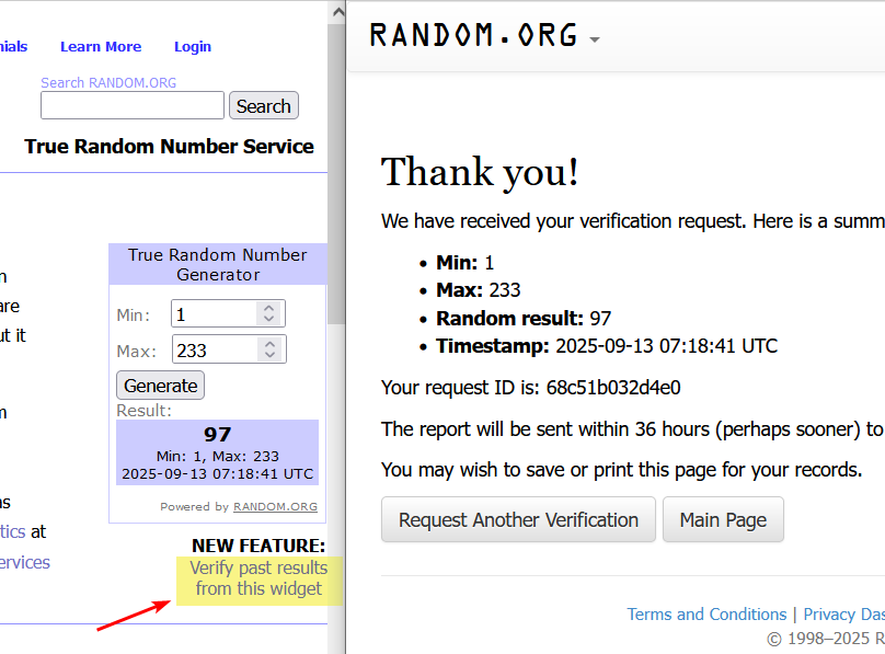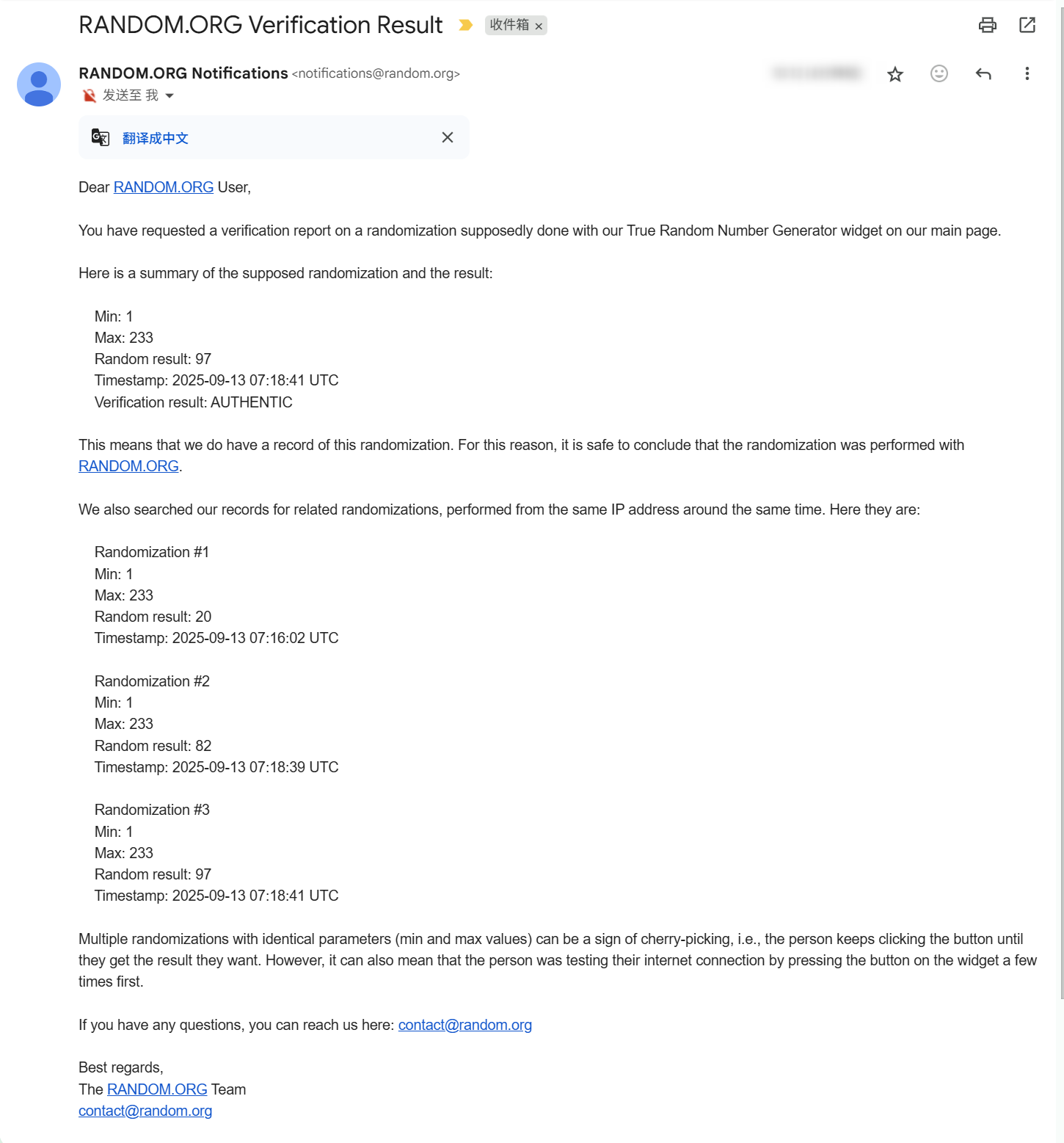 所以, 其它人不仅可以验证我的随机结果是从 random.org 官方来的. 而且总共的随机次数也是有记录的. 按照我上面设想的规则, 我不应该有多余的随机数生成次数.