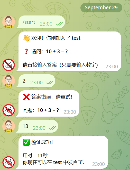 我要开发这样的一个telegram机器人机器人在群组中工作当机器人检测到有新成员加入时, 机器人将新成员设置禁言.机器人要求新成员在与机器人的私聊过程中完成人机检测.如果通过人机检测, 那么机器人解除新成员的禁言状态.人机检测的具体过程是这样的当新成员向机器人发送/start时, 机器人提问, 新成员输入文本回答.