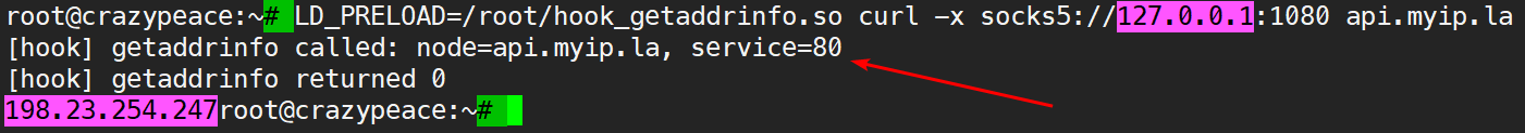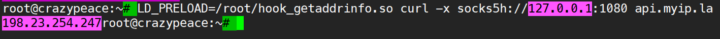LD_PRELOAD=/root/hook_getaddrinfo.so curl -x socks5://127.0.0.1:1080 api.myip.la
