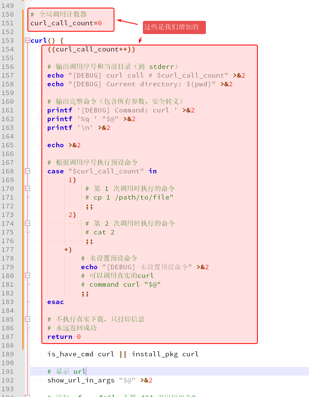 在已有的脚本头部添加一个这样的curl壳子:1) 记录并打印一个调用序号. 每次调用序号增12) 输出 pwd 当前目录3) 输出完整的 curl 命令及全部参数4) 这个curl壳, 并不去真正下载文件.5) 根据调用序号, 执行预设的命令. 如,cp file1 /path/to/file或cat file2来替代 curl -LO 或 curl -Lo 的保存文件的命令或 curl -L 的输出到stdout的命令6) 这些预设命令是会被人工编辑而增加的. 用case实现 5) 的逻辑.7) 这个curl壳, 永远返回成功.