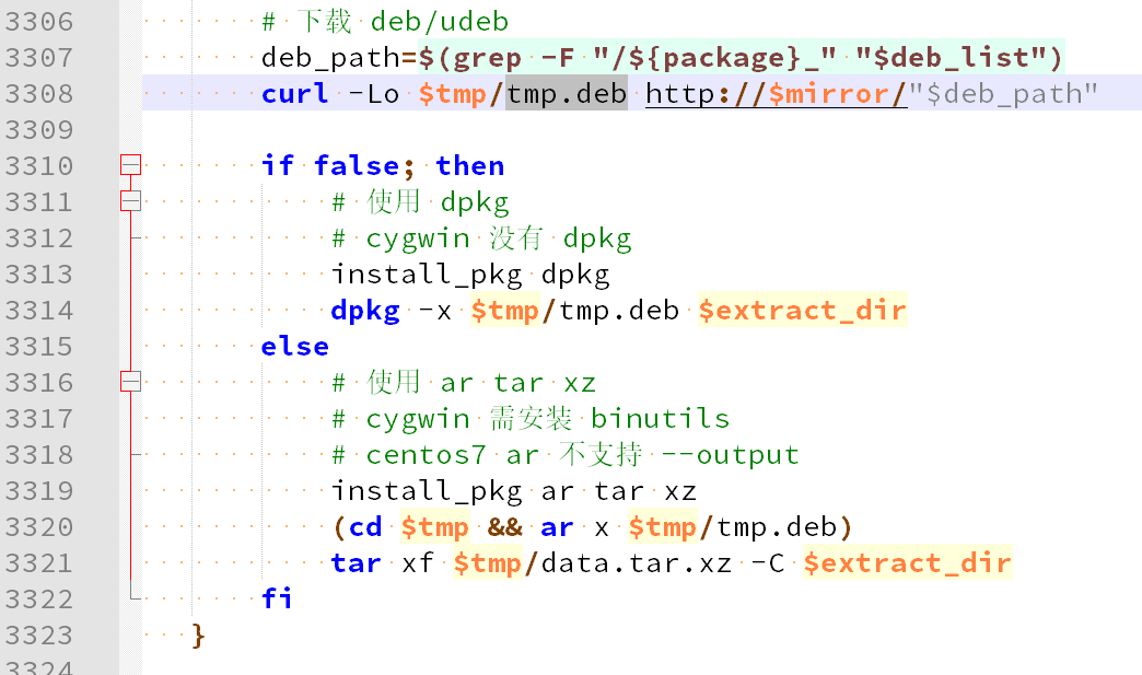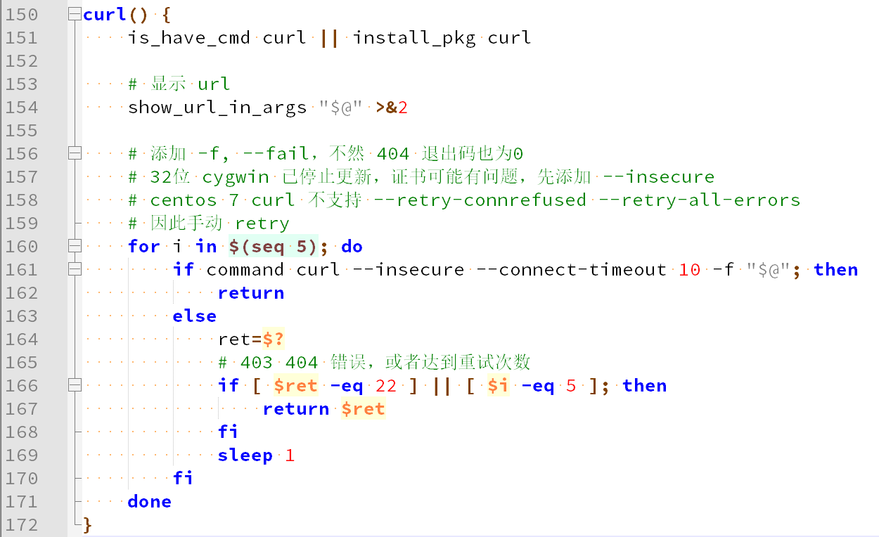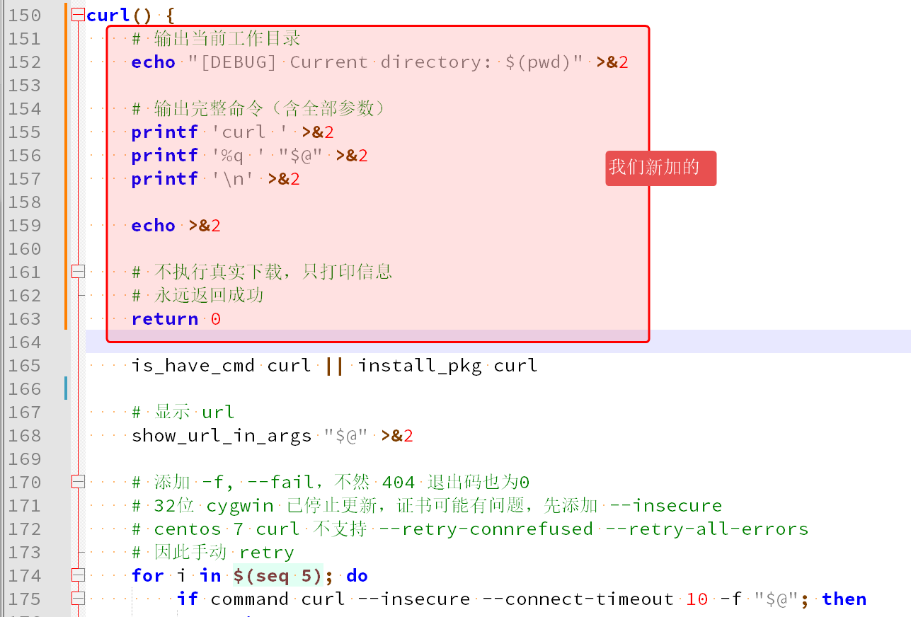 在脚本的开头, 看到作者已经实现了一个 curl 函数, 用于包装系统的curl.