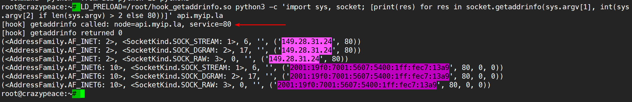 LD_PRELOAD=/root/hook_getaddrinfo.so python3 -c 'import sys, socket; [print(res) for res in socket.getaddrinfo(sys.argv[1], int(sys.argv[2] if len(sys.argv) > 2 else 80))]' api.myip.la