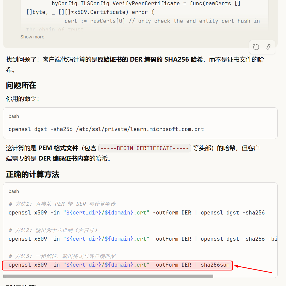 openssl x509 -in /etc/ssl/private/learn.microsoft.com.crt -outform DER | sha256sum