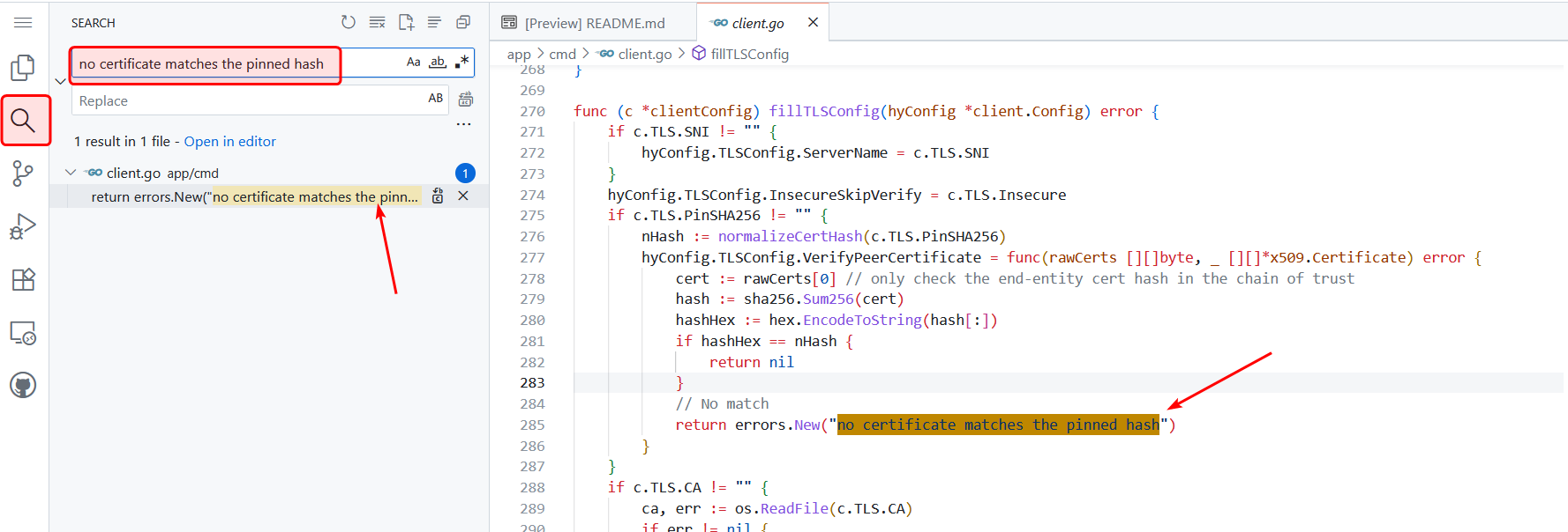 PS D:\GFW\hy2> .\hysteria-windows-amd64.exe2025-11-10T12:24:22+08:00 INFO client mode2025-11-10T12:24:23+08:00 FATAL failed to initialize client {"error": "connect error: CRYPTO_ERROR 0x12a (local): no certificate matches the pinned hash"}