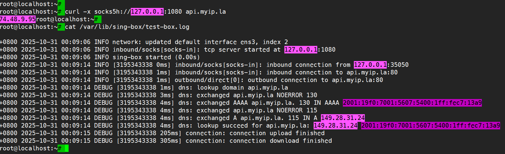 INFO [548939013 0ms] inbound/socks[socks-in]: inbound connection from 127.0.0.1:38804INFO [548939013 0ms] inbound/socks[socks-in]: inbound connection to api.myip.la:80INFO [548939013 0ms] outbound/direct[0]: outbound connection to api.myip.la:80DEBUG [548939013 0ms] dns: lookup domain api.myip.laDEBUG [548939013 5ms] dns: exchanged api.myip.la NOERROR 595DEBUG [548939013 5ms] dns: exchanged AAAA api.myip.la. 595 IN AAAA 2001:19f0:7001:5607:5400:1ff:fec7:13a9DEBUG [548939013 5ms] dns: exchanged api.myip.la NOERROR 216DEBUG [548939013 5ms] dns: exchanged A api.myip.la. 216 IN A 149.28.31.24DEBUG [548939013 5ms] dns: lookup succeed for api.myip.la: 149.28.31.24 2001:19f0:7001:5607:5400:1ff:fec7:13a9DEBUG [548939013 221ms] connection: connection upload finishedDEBUG [548939013 327ms] connection: connection download finished