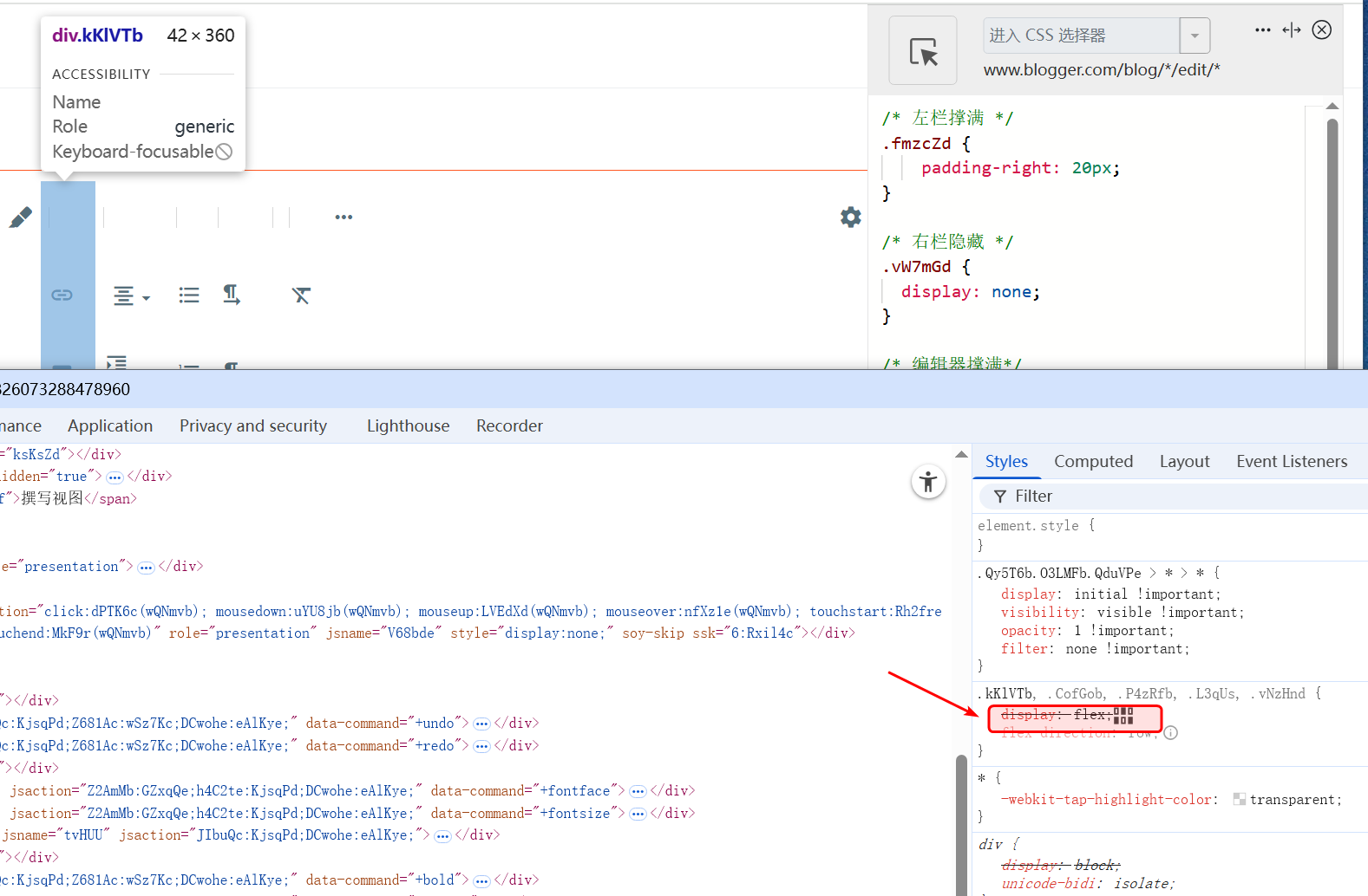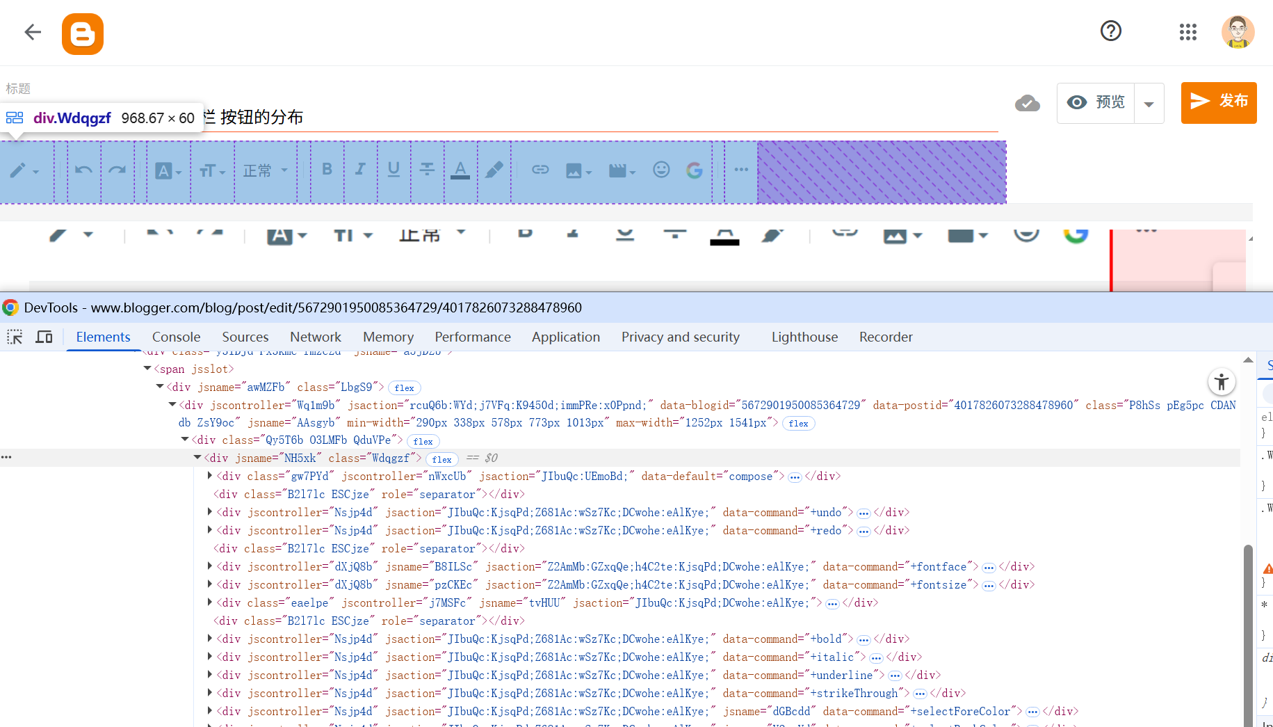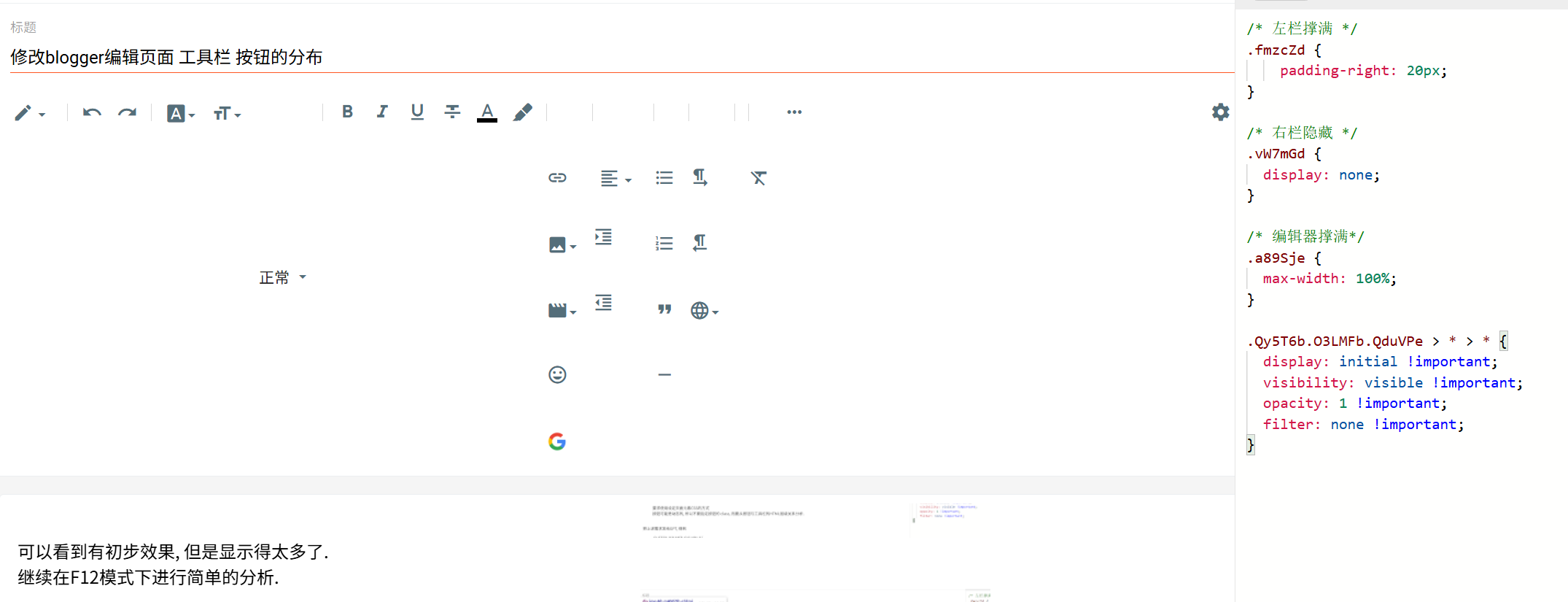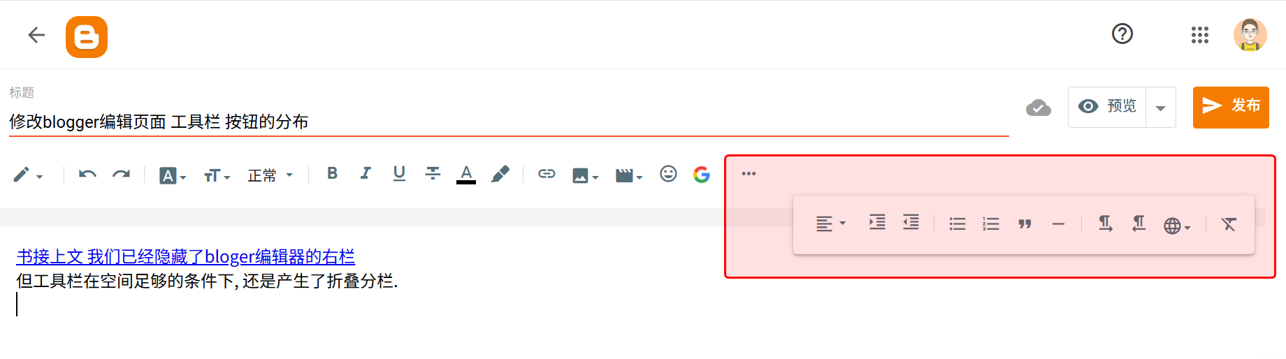 书接上文 我们已经隐藏了bloger编辑器的右栏但工具栏在空间足够的条件下, 还是产生了折叠分栏.
