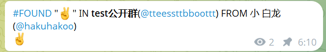 #FOUND (https://t.me/tteessttbboottt/487) "✌️" IN test公开群(@tteessttbboottt) FROM 小 白龙(@hakuhakoo)✌️