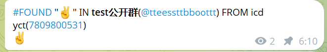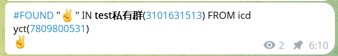 #FOUND (https://t.me/c/3101631513/2) "✌️" IN test私有群(3101631513) FROM icd yct(7809800531)✌️